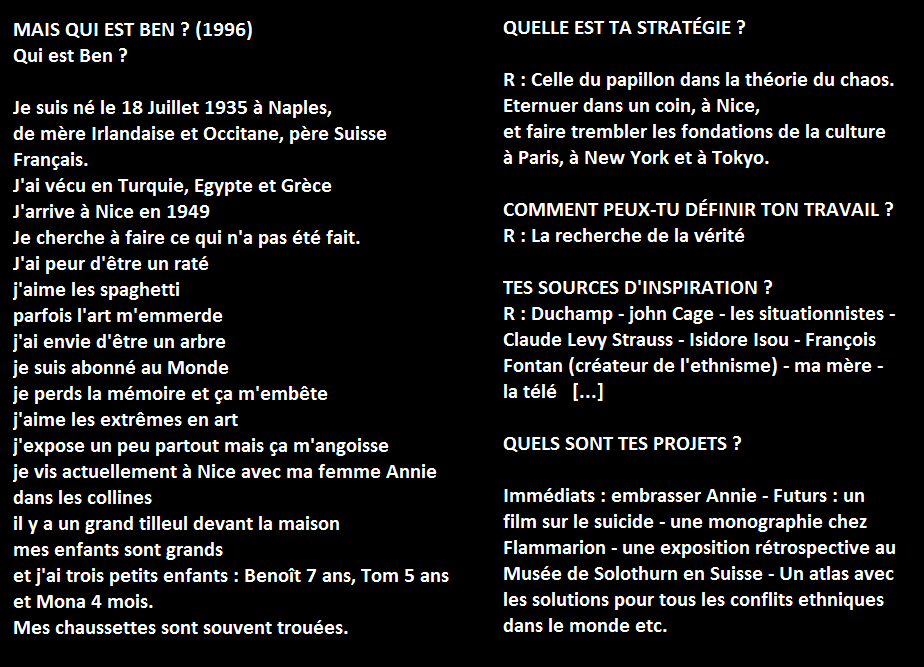 Liberamente, contando di indovinare la sensibilità di Ben, abbiamo inserito nel testo qualche immagine dai lavori e dalla vita di Ben Vautier.