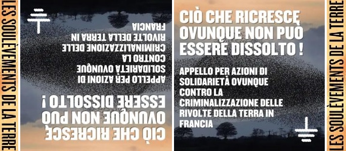 Insieme, nei giorni e nelle settimane a venire, chiediamo di moltiplicare i gesti di solidarietà, per dimostrare che ciò che sta crescendo ovunque non può essere dissolto ! Proponiamo di continuare a dare visibilità ai Soulèvements de la Terre nello spazio pubblico, nei nostri territori in tutto il mondo: davanti ai centri sociali, attraverso scritte sui muri, all’interno delle nostre lotte e dei nostri territori, attraverso striscioni e feste, presidi e azioni dirette, e qualsiasi altra azione adatta ai nostri contesti.