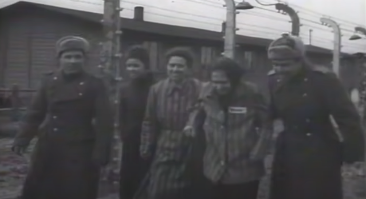 Gennaio 1945. Militari sovietici accompagnano donne appena liberate dalla prigionia ad Auschwitz. Fotogramma dal documentario Освенцим (1945), visibile su youtube.