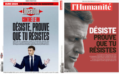 DESISTI, PROVA CHE TU RESISTI. Prima pagina del 2 luglio sui maggiori quotidiani di sinistra, che all’unisono chiedono ai governativi di rinunciare ai triangolari per convogliare voti antifascisti sul Fronte Popolare – anche a costo di eleggere sgraditi Insoumis.