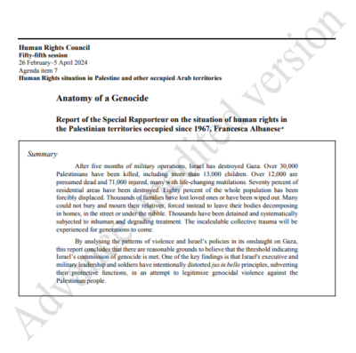 Dal sito UNHRC si può leggere e scaricare il rapporto di Francesca Albanese ANATOMIA DI UN GENOCIDIO nella versione 25 marzo 2024 (link apre in nuova scheda)