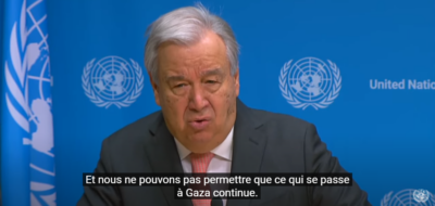 Comunicato 15 gennaio 2024 del segretario generale ONU Antonio Guterres. Chiede immediato cessate il fuoco umanitario in Palestina e avverte “non possiamo vedere in Libano quanto stiamo vedendo a Gaza”. Apri video in nuova scheda dal canale youtube Nazioni Unite, durata 9 min., emesso a NYC ore 12 del 15/1, lingua inglese con s.t. e traduzione codificata a richiesta.