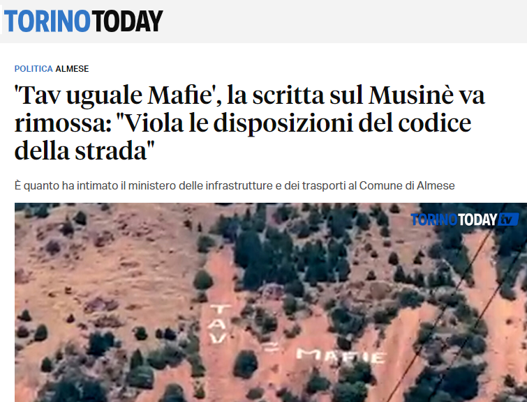 TAV=MAFIE sul Musiné: rimuovere la scritta sulla porta della Val Susa? L’equazione non è abbastanza ‘woke’ per descrivere i maneggi negli appalti?